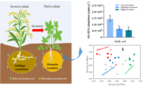 In the current context of globalization, the invasion of alien plants has become a significant threat to biodiversity, food security, economy, and human well-being. The specific role of soil microorganisms in plant invasion is still unclear. This article studies the microbial communities in the background soil and rhizosphere soil of plants under different invasion levels (<10%, 50%, and>90%) of Canadian goldenrod, revealing that Canadian goldenrod may enhance its invasion ability by regulating the types and relative abundance of functional microorganisms in the soil.