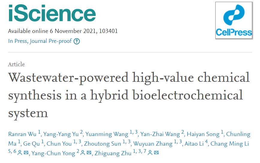 Recently, the research "Upgraded wastewater-energy-chemical nexus for wastewater" powered high-value chemical production" have been published by the team of Professor Yong Yangchun from our School. The microbial electrochemical system (MES) has shown great potential in the utilization of sewage resources. However, due to the thermodynamic and kinetic limitations of cathode catalysis, the diversity and product value of MES products are greatly restricted. In response to this key issue, the modified system uses microorganisms to release energy (anode) from sewage to provide power for enzyme-catalyzed production of high-value products (cathode). The hybrid design of MES overcomes the thermodynamic and kinetic limitations of the cathode, and increases the added value of the product by about 100 times compared with traditional MES products. It is the first to realize the conversion of sewage energy into high-value pharmaceutical chemicals. This research provides a new path for the high-value utilization of "wastewater-energy-medicine" for wastewater energy recovery, and provides new ideas for promoting the new pattern of "wastewater resource plant".