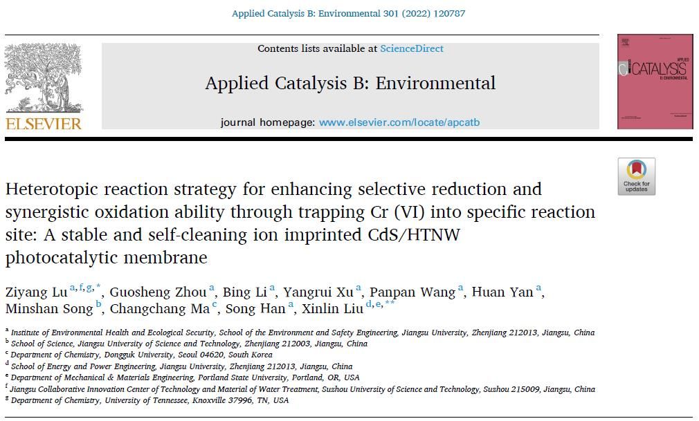 Recently, associate researcher Lu Ziyang of our school published a paper entitled "Heterotopic reaction strategy for enhancing selective reduction and synergistic oxidation ability through trapping Cr in the top academic journal Applied Catalysis B: Environmental (Impact Factor: 19.503, District 1, Top Journal) in the field of environmental protection. (VI) into specific reaction site: A stable and self-cleaning ion imprinted CdS/HTNW photocatalytic membrane” research paper. Jiangsu University is the first unit to complete the thesis.