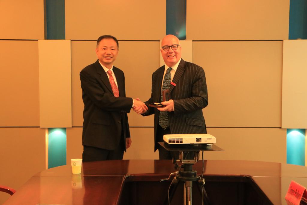 At first, on behalf of School of the Environment and Safety Engineering, the dean, Prof. Wu Xiangyang, expressed the warmest welcome to the visit of Prof. Pollard. Then they exchanged gifts. After that, both sides had a sufficient exchange of views on how to promote communication among young teachers, how to formulate implementation rules for the double degree program between Cranfield University and Jiangsu University, and how to carry out cooperative research, and finally reached a consensus. Besides, both sides reached a preliminary agreement on the cooperative research and project application concerning the issues “environmental risk analysis” and “recycling and reuse of environmental waste”, which has laid good foundation for further work. Prof. Simon Pollard showed great interest in the topics discussed at the meeting, especially the topic on cooperative research, and he believed that with the advance of the double degree program, both sides would have deeper cooperation in teachers’ academic exchange and scientific research.