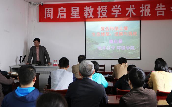 On April 27, 2016, Professor Qi-Xing Zhou and Professor Jing-Chun Tang from Nankai University made an academic visit to our school. This visit was officially invited by Professor Xiang-Yang Wu, the dean of our school. Prof. Zhou delivered an interesting and impressive presentation titled as “Ecological bioremediation of polluted soil: progress and challenge”.