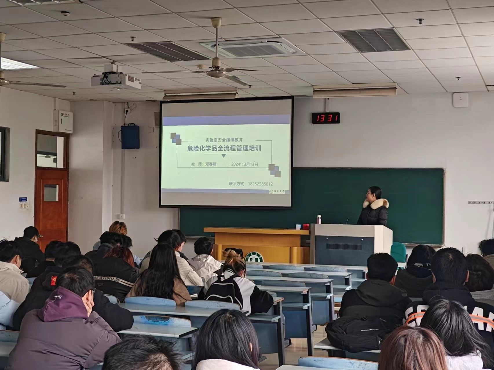 In order to further standardize the management of hazardous chemicals and hazardous waste in laboratories and enhance the safety awareness of graduate research, our institute organized a special training on laboratory safety continuing education - full process management of hazardous chemicals and hazardous waste recycling on March 13, 2024. At the training session, Teacher Deng Chunmeng gave a detailed explanation of the full process management of hazardous chemicals from the aspects of classification, procurement, transportation, storage, use management, and disposal. Through the analysis of various hazardous chemical accident cases in the laboratory, students were able to have a clearer understanding of the importance of standardized use and management of hazardous chemicals. Subsequently, Teacher Deng introduced the requirements for the collection, temporary storage, and transfer of laboratory waste, as well as the management process for recycling laboratory waste in the college, emphasizing the necessity of standardizing the recycling of laboratory waste.