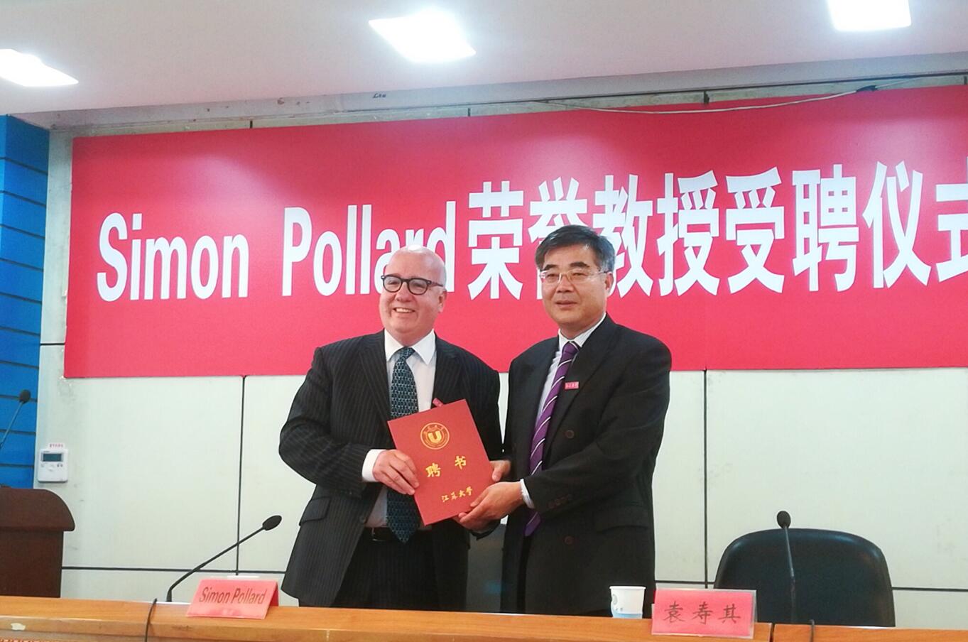 The appointment ceremony of honorary professor for Simon Pollard, DSc FREng, followed by his academic report, was held at No. 3 auditorium of Jiangsu University Conference Centre, on the afternoon of 10 September, 2018. Prof. Yuan Shouqi, Chairmangsu University, chairman chair of the Party committee of Jiangsu University; Prof. Wu Xiangyang, Dean of School of the Environment and Safety Engineering; and Prof. Du Daolin, Deputy Dean of School of the Environmental and Safety Engineering attended the ceremony. About 100 representatives of teachers and students from School of the Environmental and Safety Engineering and School of Material Science and Engineering were present at the ceremony and listened to the report. The ceremony was presided over by Prof. Du Daolin.