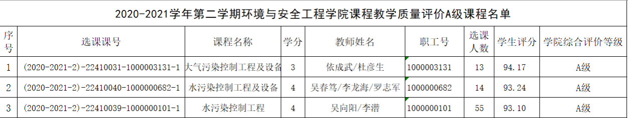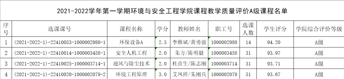 依据“关于印发《江苏大学本科课程教学质量评价及奖励办法(试行)》的通知”(江大校〔2013〕356号),以课程教学班为评价单元,在前两学期所有课程学生评教平均分位列学院排名前50%的课程中,学院课程教学质量评价工作小组根据《环安学院2021年课程教学质量评价细则》,对本学期课程评教结果在学院排名前30%的课程,结合领导干部、同行听课情况和座谈会、信息员反馈等相关质量监控信息进行综合评价,A级教师课程班比例不超过本学期学院课程教学班总数的20%,经学院院务会研究决定以下课程作为A级教师课程班上报教务处。