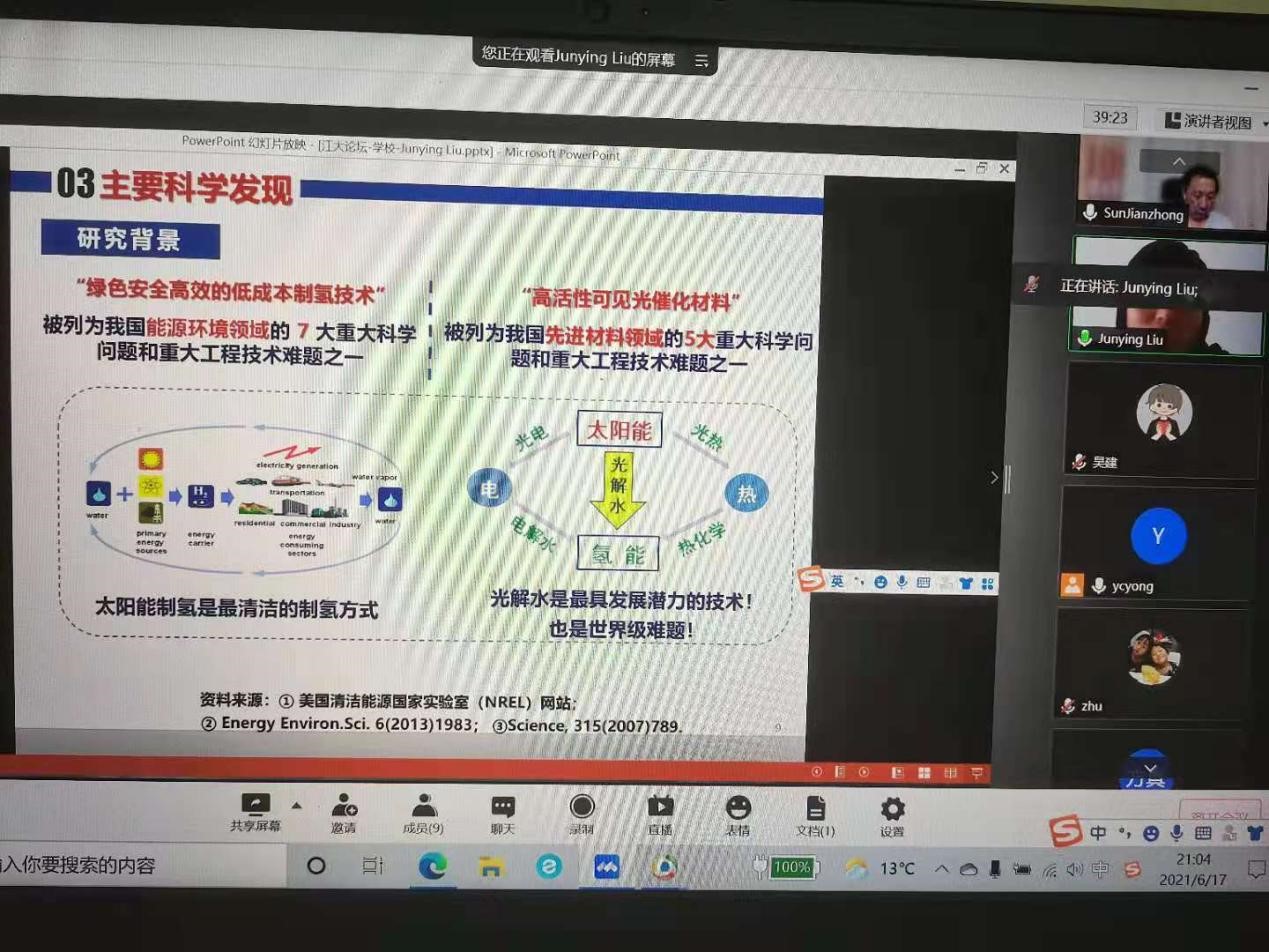 2021年6月27日晚,通过腾讯视频会议,德国汉堡大学博士后刘军营向我院师生作了“高活性可见光催化”方面的学术报告,并介绍了自己的主要科学成就。刘博士是我校校友,先后就读于江苏大学、华东师范大学、上海交通大学,长期从事纳米材料自组装在光催化中的研究工作,已发表高水平论文近20篇。环安学院党委书记黄勇强代表学院出席会议,报告会由生物质能源研究院院长雍阳春研究员主持。