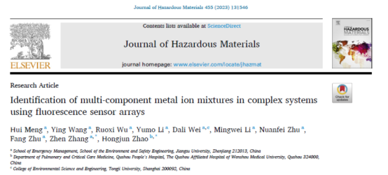 我院环境污染与健康团队的最新研究论文“Identification and selective monitoring of multi-component metal ion mixtures in complex systems using fluorescence array sensors” 在环境科学与工程领域顶级期刊Journal of Hazardous Materials (IF:13.6)上在线发表。江苏大学为第一完成单位,本院教师孟辉为第一作者,张祯教授为通讯作者。