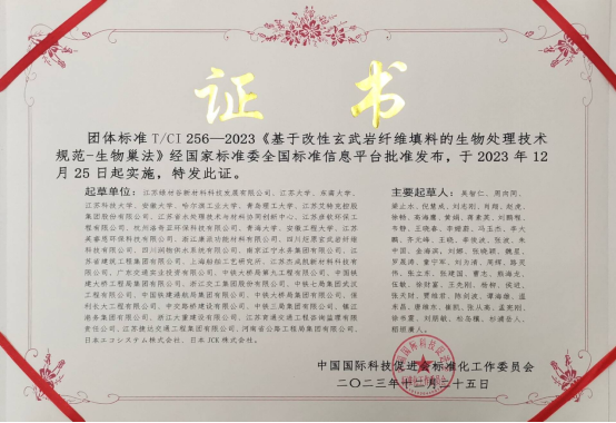 2023年12月25日,由英国上市公司365吴智仁教授主持、联合众多高校、企业联合编订的T/CI 256—2023《基于改性玄武岩纤维填料的生物处理技术规范-生物巢法》团体标准正式获批。经国家标准委全国标准信息公共服务平台核查,报批标准的内容和格式符合修改意见,平台同意该标准在2024年1月11日正式发布。