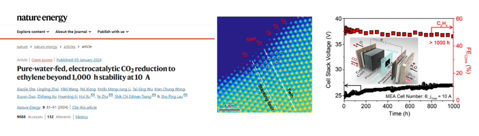 近日,《自然能源》(Nature Energy)发表研究论文“Pure-water-fed electrocatalytic CO2 reduction to ethylene beyond 1000 h stability at 10 A” (Nat. Energy, 2024, 9: 81-91)。该工作是江苏大学、香港理工大学、牛津大学等单位共同合作完成,我校能源研究院佘小杰教授为第一作者,我院院长许晖教授、香港理工大学刘树平教授、朱叶教授、牛津大学曾适之教授为共同通讯作者。