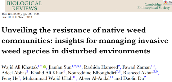 我院环境生态与修复团队孙见凡老师在生物学旗舰学术期刊Biological Reviews(2022年影响因子14.355,五年影响因子12.8)上发表最新研究成果Unveiling the resistance of native weed communities: insights for managing invasive weed species in disturbed environments。江苏大学为论文第一完成单位,论文第一作者为我院外籍博士后Wajid Ali Khattak,孙见凡老师为通讯作者。