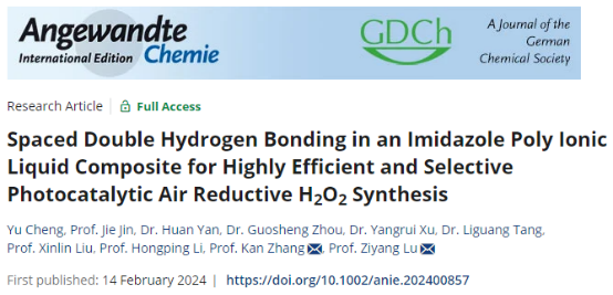 近日,我院的最新研究论文“Spaced Double Hydrogen Bonding in an Imidazole Poly Ionic Liquid Composite for Highly Efficient and Selective Photocatalytic Air Reductive H2O2 Synthesis”在Angewandte Chemie-International Edition (IF:16.6)上在线发表。江苏大学为第一完成单位,本院硕士研究生程煜、教师金杰为共同第一作者,本院教师逯子扬为通讯作者。