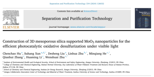 近日,我院环境污染与健康团队荀苏杭老师在Separation and Purification Technology(IF: 8.6)期刊发表最新研究论文“Construction of 3D mesoporous silica supported MoO3 nanoparticles for the efficient photocatalytic oxidative desulfurization under visible light”。江苏大学为第一完成单位,我院研究生胡陈超为第一作者,我院荀苏杭老师为共同通讯作者。