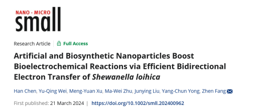 近日,我院最新研究论文“Artificial and Biosynthetic Nanoparticles Boost Bioelectrochemical Reactions via Efficient Bidirectional Electron Transfer of Shewanella loihica”在Small (IF:13.3)上在线发表。江苏大学为唯一完成单位,2020级硕士研究生陈涵为第一作者,本院教师方真为通讯作者。