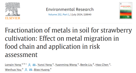 近日,我院最新研究论文“Fractionation of metals in soil for strawberry cultivation: Effect on metal migration in food chain and application in risk assessment”在Environmental Research (IF: 8.3)上在线发表。江苏大学为第一完成单位,我院教师杨岚钦为第一作者,杨岚钦和游文华为通讯作者。