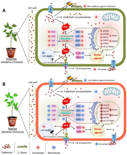 研究结果表明,重金属镉污染下,南美蟛蜞菊相比本地同属植物蟛蜞菊有更高的耐受能力,叶片中积累了更高浓度的重金属镉元素,激发了更高的酶促抗氧化系统和非酶促抗氧化系统,同时也上调了与防御系统相关的基因表达水平,进而提高了入侵植物对食草动物的抵抗力。
