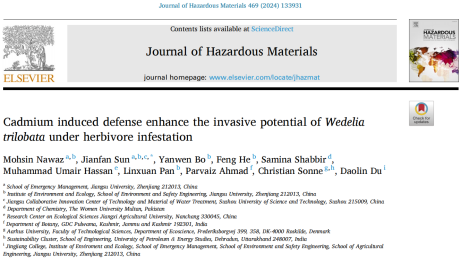 近日,我院环境生态与修复团队孙见凡老师在Journal of Hazardous Materials (IF: 13.6)上发表最新研究成果“Cadmium induced defense enhance the invasive potential of Wedelia trilobata under herbivore infestation”。江苏大学为第一完成单位,我院外籍博士后Mohsin Nawaz为第一作者,孙见凡老师为通讯作者。