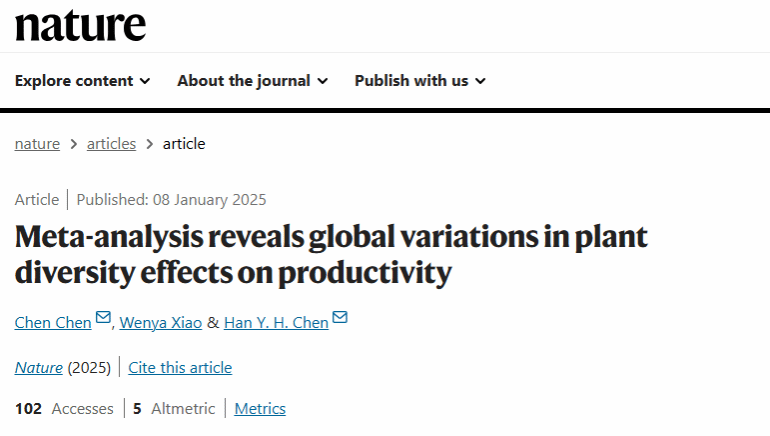 近日,国际顶级学术期刊《自然》(Nature)发表了题为“Meta-analysis reveals global variations in plant diversity effects on productivity”的研究论文。该论文由加拿大湖首大学(Lakehead University)、江苏大学及中国科学院植物研究所等多家单位联合完成。中科院植物研究所陈晨副研究员为论文第一作者,江苏大学环安学院肖文娅副教授为论文第二作者,陈晨副研究员与加拿大湖首大学Han Y.H. Chen教授为论文共同通讯作者。