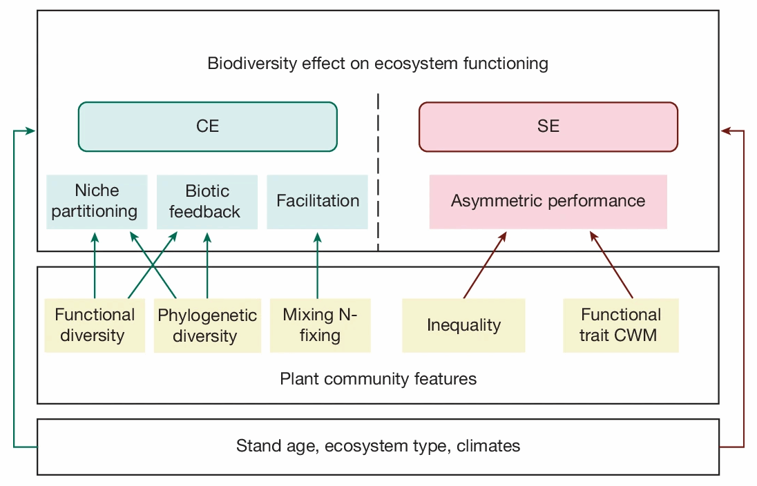 生物多样性与生态系统功能之间的关系(BEF)始终是生态学领域的重要研究方向。越来越多的研究表明,生物多样性的增加可能通过一系列复杂机制显著提升群落生产力。生物多样性效应(NE)可以进一步划分为互补效应(CE)和选择效应(SE)。这两种效应与生态学中物种相互作用的关系更加直接和紧密,可以揭示多样性影响的重要内在机制。然而,对于全球范围内开展的BEF试验中,不同的生物多样性水平、生态系统类型、气候条件及林龄导致不同结果的机制,认识仍然有限。