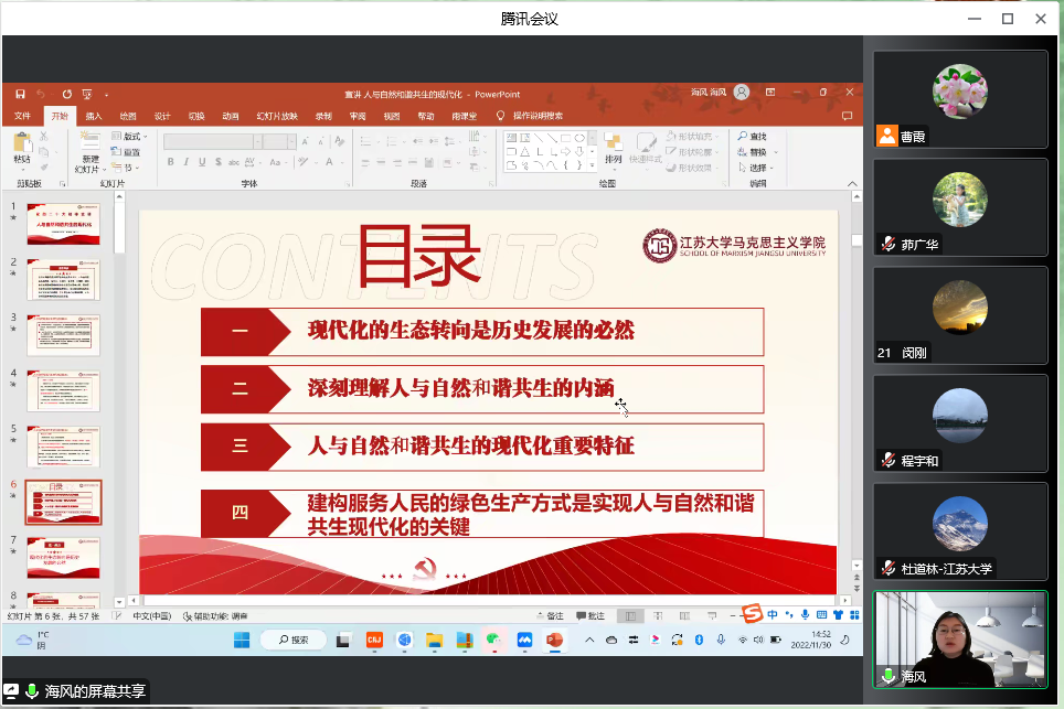 11月30日,环安学院党委结合学院学科专业特点,再次开展党的二十大精神宣讲活动,邀请马克思主义学院靳媛媛老师线上宣讲。宣讲会由学院党委副书记、院长杜道林主持,学院全体教职工、全体学生党员共计200余人在线聆听学习。