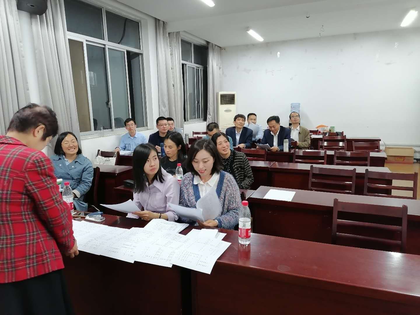 经过认真思考,在学院黄书记、学院工会、朱红力老师指导下,学院选用了歌曲《绒花》。目前已经集中练习了三次,请了外面的指导老师张弘。第一次练习时间为4月27日下午2:30分,于主楼2311室集中练习,领导和老师们都积极参与,给来的老师分了声部。