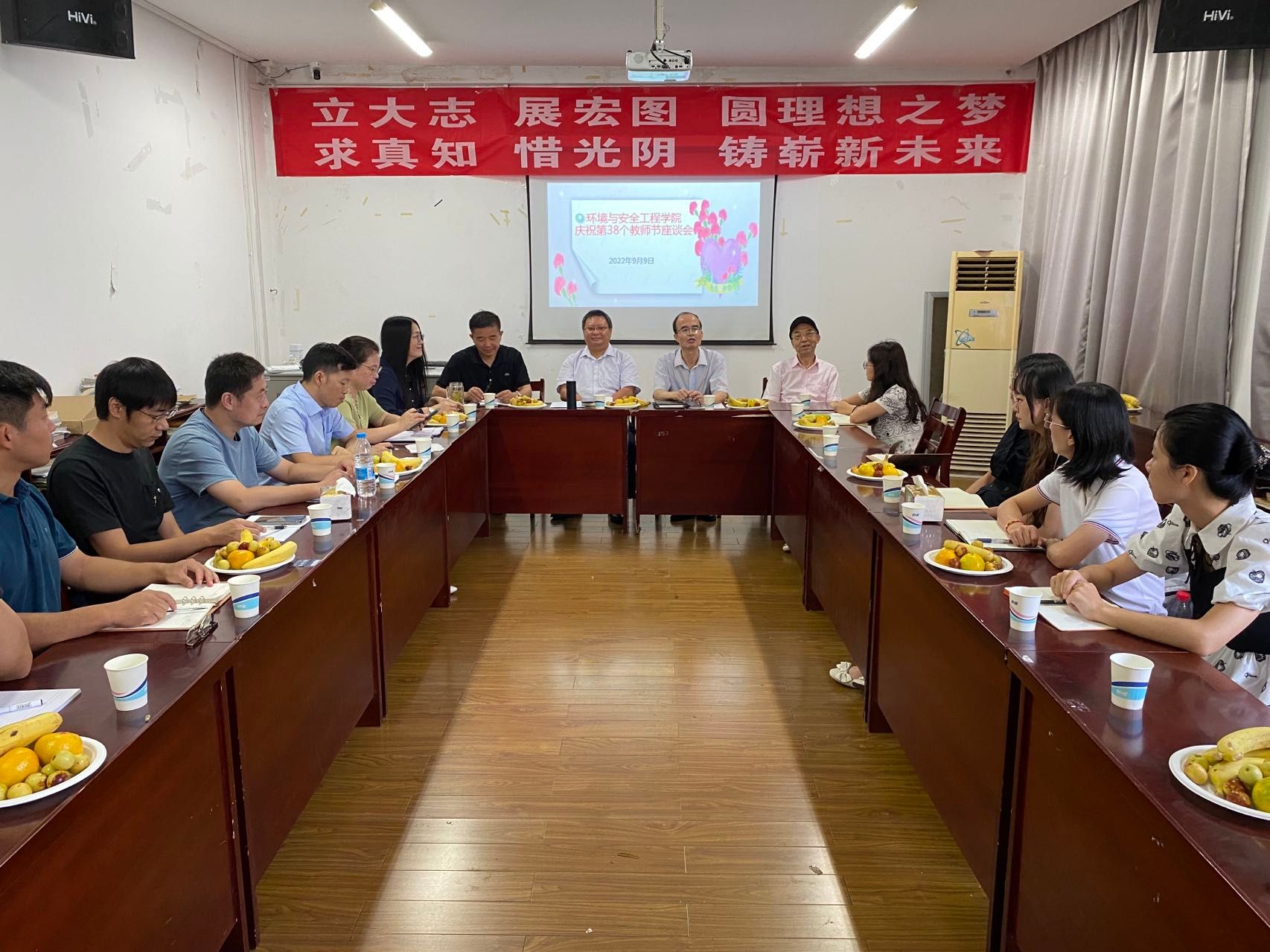 在喜迎党的二十大召开之际,环安学院持续推进“我为师生办实事”活动。为了解新学期初教职工的困难和需求,9月9日,在第38个教师节前一天,环安学院庆祝教师节座谈会在主楼2311会议室召开,领导班子全体成员、关工委老同志、近一年来新入职教师、老教师代表、党外人士代等参加。会议由学院党委书记黄勇强主持。