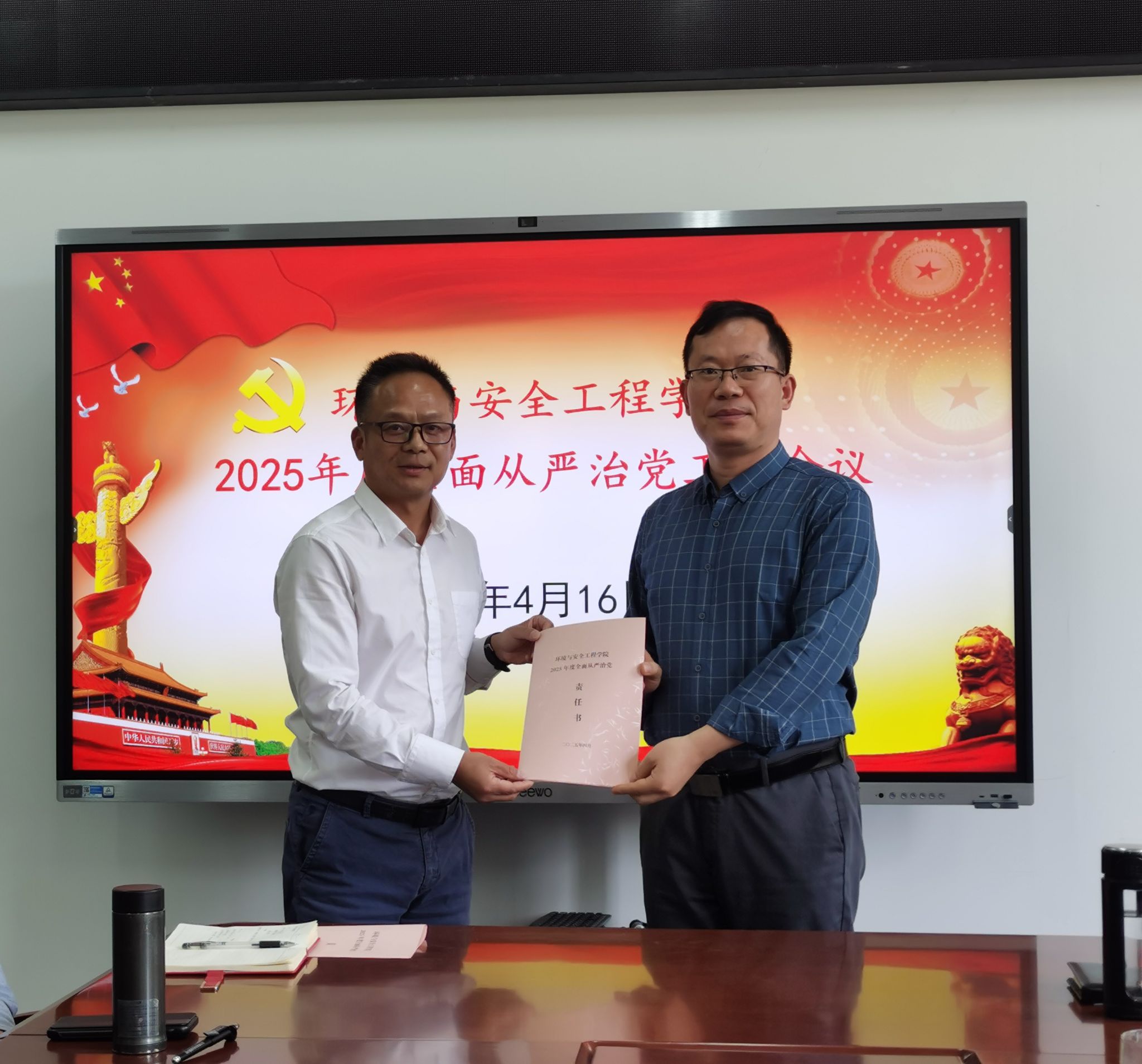 4月16日,环安学院在环安楼310会议室召开2025年度全面从严治党工作会议。学院领导班子成员、党委委员、党支部书记、系主任及全体科级干部参加了会议。会议由党委书记夏建如同志主持。